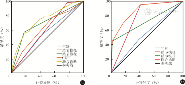 注:CDFI为彩色多普勒血流成像;PPV为阳性预测值;NPV为阴性预测值;AUC为曲线下面积;CI为可信区间;a与联合诊断AUC相比,差异具有统计学意义(P<0.001、<0.001、=0.009、<0.001) |