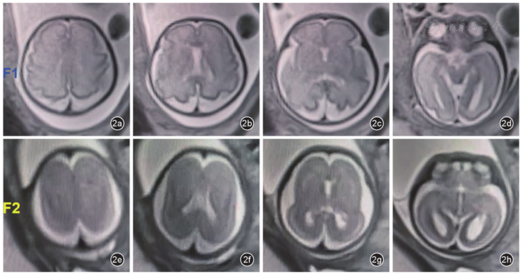 孕妇,31岁,孕4产1,2023年自然受孕,否认自身疾病史及遗传疾病等。孕早期超声检查提示双绒毛膜双羊膜囊,早中孕期超声检查结果未见明显异常。孕29+2周行超声检查(图1):采用胎儿颅脑五横切面法观察颅内结构。F1胎儿(宫腔偏右侧):(1)颅顶部横切面:脑中线、脑白质、顶枕沟、额上沟、中央沟、中央前沟、中央后沟、顶内沟可显示。(2)经胼胝体膝部和压部横切面:透明隔腔、韦尔加腔、胼胝体膝部及压部、侧脑室体部,脑沟回可观察顶枕沟、大脑外侧裂、中央前沟、中央沟、扣带沟。(3)侧脑室水平横切面:透明隔腔、侧脑室后角、脉络丛;扣带沟、形似"π"形的大脑外侧裂、颞上沟、颞下沟。(4)丘脑水平横切面:可针对透明隔腔、胼胝体膝部、丘脑、大脑脚及第三脑室进行观察,脑沟回可显示大脑外侧裂、颞上沟、颞下沟及扣带沟。(5)小脑水平横切面:可观察透明隔腔、丘脑、小脑、小脑上蚓部及后颅窝池,脑沟回可显示大脑外侧裂及颞上沟。F2胎儿(宫腔偏左侧)头围小(-2.78SD),左侧侧脑室轻度增宽(1.05 cm),脑皮质情况:(1)颅顶部横切面:顶枕沟、额上沟、中央前沟、中央沟、中央后沟、顶内沟未显示;(2)经胼胝体膝部和压部横切面:顶枕沟、中央沟、中央前沟、扣带沟未显示;(3)侧脑室水平横切面、丘脑水平横切面、小脑水平横切面:大脑外侧裂呈尖峰无平台形,颞上沟、颞下沟未显示;(4)三维容积成像显示,F2胎儿脑表面光滑,可见大脑外侧裂,未发现其他脑沟回。超声提示:宫内双活胎(双绒毛膜双羊膜囊),F1胎儿未见明显异常;F2胎儿头围小、左侧侧脑室轻度扩张、脑皮质发育异常,考虑无脑回畸形。