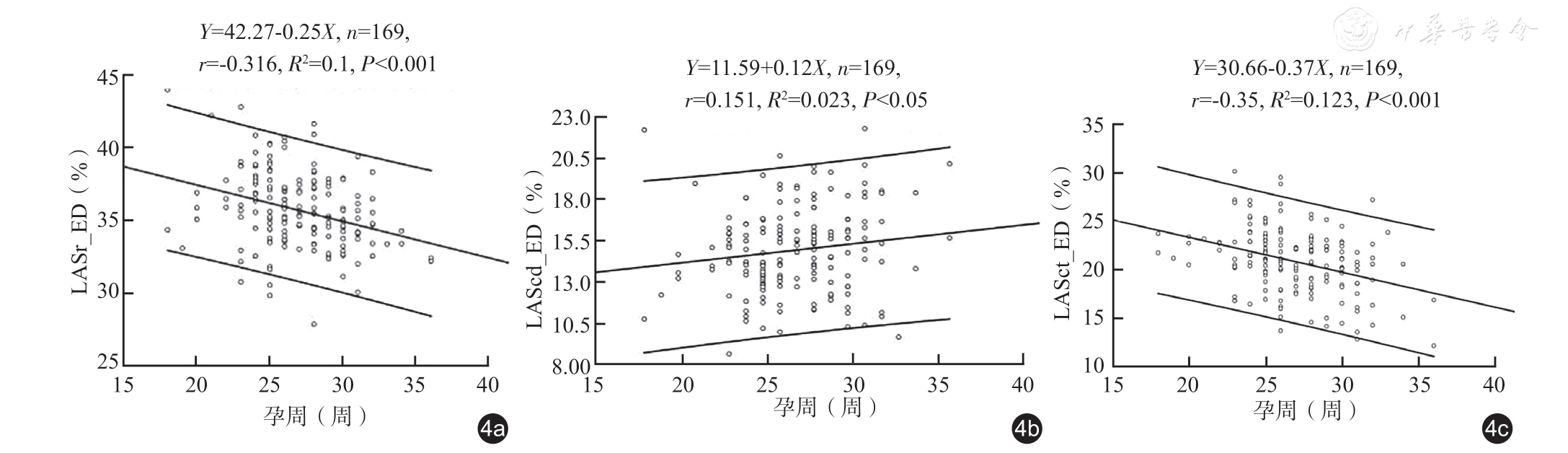 选取2021 年11 月至2022 年1 月在浙江大学医学院附属邵逸夫医院超声科接受胎儿超声心动图检查的正常妊娠中、晚孕期单胎胎儿180 例,共获取611 个不同心尖角度胎儿四腔心动态图像,应用2D-STI 分析获得左心房储存期峰值应变(LASr_ED)、管道期峰值应变(LAScd_ED)和收缩期峰值应变(LASct_ED),其中有11 例共计32 个动态图像2D-STI 分析心房收缩的起始点不能识别,无法区分心房收缩期与管道期。选取169 例四腔心切面心尖方向为10:30~1:30 能良好追踪并识别左心房3 个时相功能的病例与孕周进行线性回归分析。选取能良好追踪并识别左心房3 个时相的动态图像579 个,其中中孕期18~24 周的图像126 个、25~28 周的图像190个,晚孕期29~32 周的图像150 个、33~36 孕周的图像113 个;按不同心尖方向分成4 组,组1 心尖方向10:30~1:30,组2 心尖方向1:30~4:30,组3 心尖方向4:30~7:30,组4 心尖方向7:30~10:30;同一孕期不同心尖方向组间应变参数比较采用F 检验和LSD-t 检验。