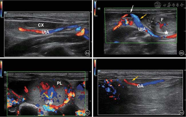 注:CX 为宫颈,UtA 为子宫动脉,PL 为胎盘,UtB 为子宫动脉分支,OA 为卵巢动脉图4 孕鼠子宫动脉各分段及卵巢动脉彩色多普勒超声图像。黄色箭头示测量点;图a:子宫动脉沿宫体向头侧走行;图b:子宫动脉沿宫体轮廓弯曲走行(星号示膨大部;白色箭头示缩细部);图c:子宫动脉于子宫膨大部发出分支向胎盘内延伸;图d:卵巢动脉主干向子宫角方向走行 |