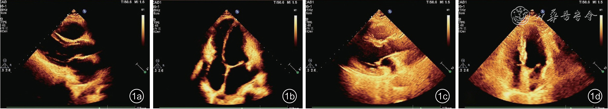 图1 缩窄性心包炎超声诊断与超声漏诊图像。图a、b 分别为超声心动图诊断的缩窄性心包炎左心室长轴及心尖四腔二维图像;图c、d 分别为超声心动图漏诊的缩窄性心包炎左心室长轴及心尖四腔二维图像 |