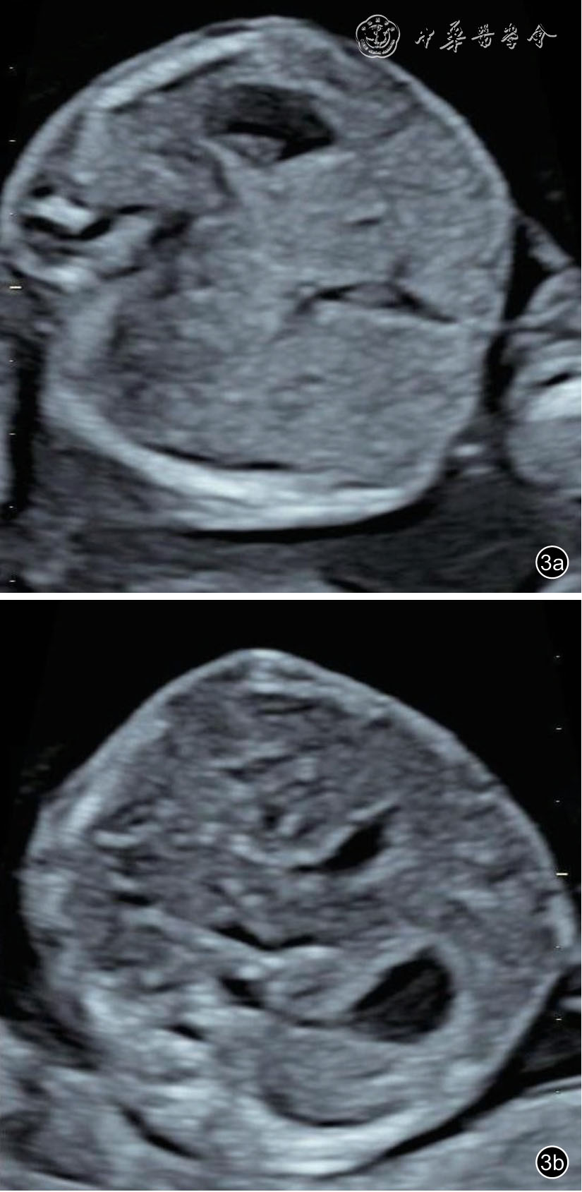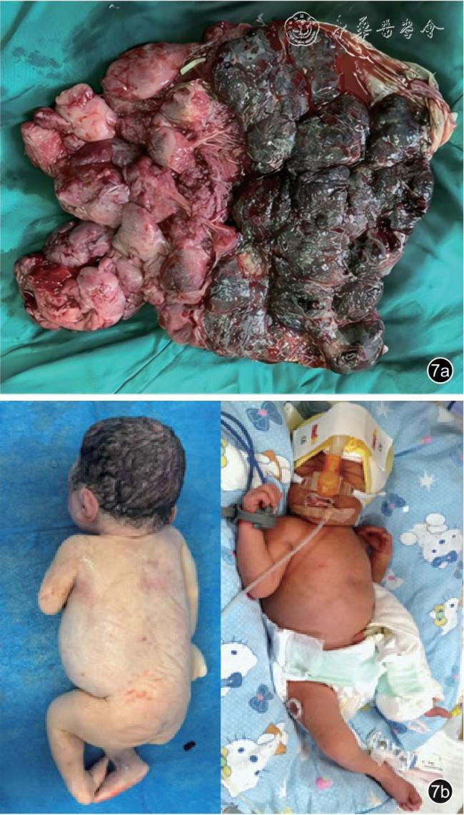 观察TAPS 孕妇的胎盘,母体面可见供血儿侧胎盘苍白、水肿增厚,受血儿侧胎盘暗红、较供血儿侧薄(图7a);供血儿呈贫血貌、受血儿呈多血貌,两胎儿肤色有明显差异(图7b)。