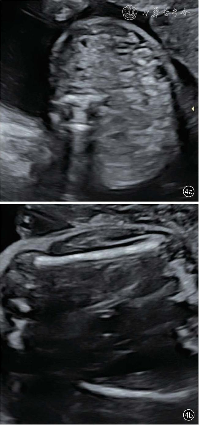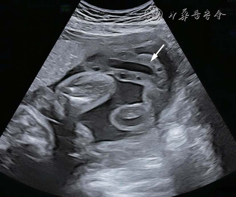 图4 双胎贫血-红细胞增多序列征胎儿孕22+5 周产前超声图像可见供血儿部分肠管肠壁回声增强(图a),略低于骨骼回声(Ⅰ级)(图b)