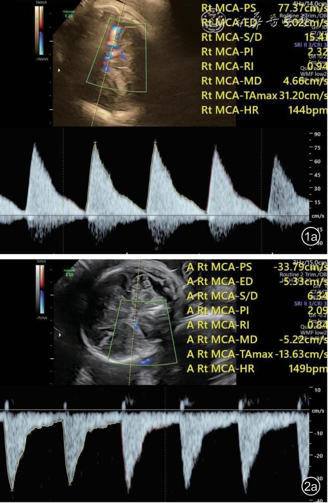图1 双胎贫血-红细胞增多序列征胎儿孕29+1周产前超声图像。图a:供血儿大脑中动脉峰值流速(MCA-PSV)增高,约1.61 中位数倍数(MoM);图b:受血儿MCA-PSV 降低,约0.87 MoM