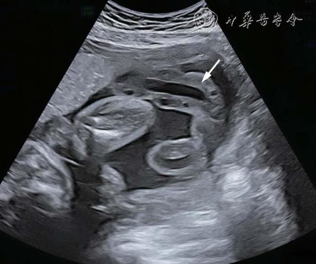 图6 双胎贫血-红细胞增多序列征胎儿孕28 周产前超声图像。可见受血儿脐带游离段增粗、水肿,箭头示增厚的华通胶
