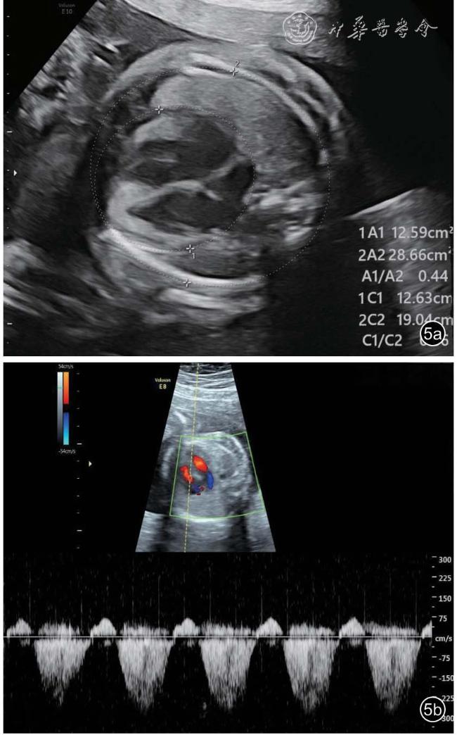 图5 双胎贫血-红细胞增多序列征胎儿孕23+5 周产前超声图像。图a:可见供血儿心胸比增大(约为0.44);图b:彩色多普勒可见二尖瓣、三尖瓣轻度反流束,连续多普勒测及反流速度约为2.7 m/s