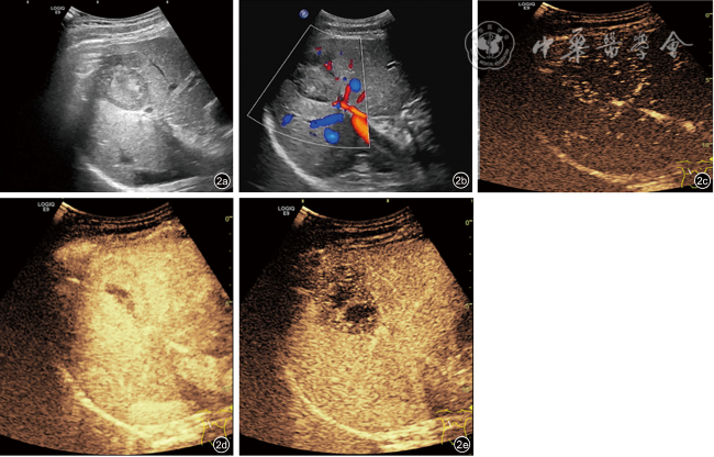 图2 肝病灶彩色多普勒超声及超声造影图像。图a:肝内见一不均质低回声团块;图b:彩色多普勒显示周边较丰富血流信号,内部少量血流信号;图c:注射造影剂后14 s肿块周边呈快速不均匀增强;图d:门脉早期开始消退;图e:延迟期进一步消退 |