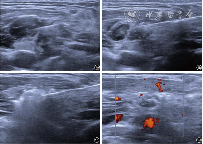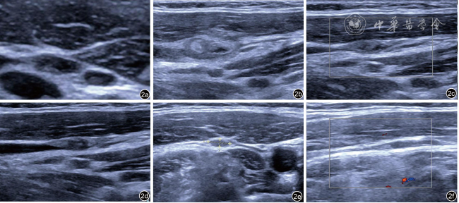图2 甲状腺乳头状癌复发性颈部转移性淋巴结消融术前、术后超声图像。图a为术前颈部转移性淋巴结;图b为消融术后1个月复查图,可见混合不均匀回声区,以高回声为主,范围较原有淋巴结稍大;图c为术后3个月复查图,可见混合不均匀稍高回声区较前次复查缩小;图d为术后6个月复查图,与前次复查相仿;图e为术后12个月复查图,稍高回声区较前次复查缩小;图f为术后18个月复查图,原稍高回声区几乎显示不清,考虑消融灶几乎完全吸收 |