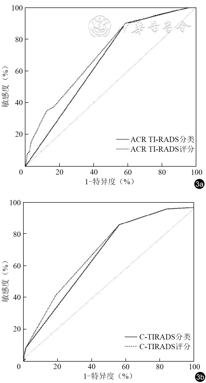 Both ACR TI-RADS and C-TIRADS scores and classifications of malignant nodules were higher than those of benign nodules (P<0.05), with AUC values being 0.702, 0.658, 0.710, and 0.686, respectively. The DeLong test shows the AUC values of the scoring systems were greater than those of the classification systems (Z=3.768 and 2.370, respectively, P=0.0002 and 0.0178, respectively). When the Youden index was the largest, the sensitivity, specificity, positive predictive value (PPV), and negative predictive value (NPV) of the ACR TI-RADS system were 89.66%, 41.70%, 89.93%, and 59.00%, respectively; and the corresponding values of the C-TIRADS system were 88.71%, 44.26%, 90.23%, and 59.69%, with no statistically significant differences between the two systems (χ2=0.642, 0.313, 0.070, and 0.025, respectively, P=0.423, 0.576, 0.791, and 0.875, respectively).