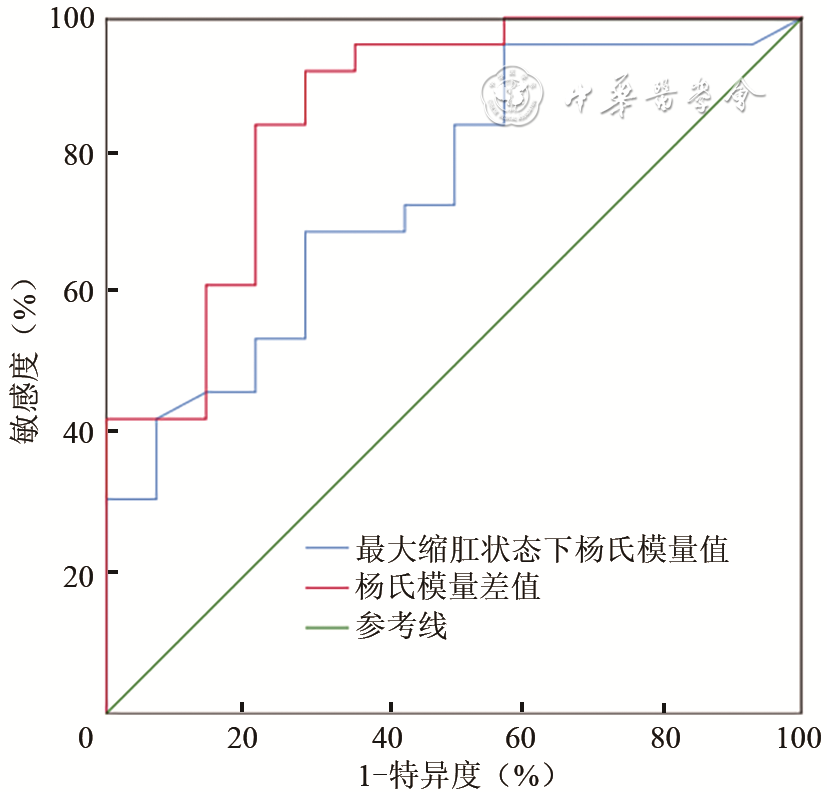 [13]在肛提肌弹性成像技术研究中也证实了这点,他们认为PFD患者肛提肌成分中肌小节内结蛋白和波形蛋白表达减低、成纤维细胞增多导致纤维化修复增生,会导致盆底肌肌力及肌张力逐渐减弱,造成主动收缩的杨氏模量值变小,PR成分的改变会造成静息状态下杨氏模量值变大,从而使杨氏模量差值出现差异性。本研究中虽然BND的