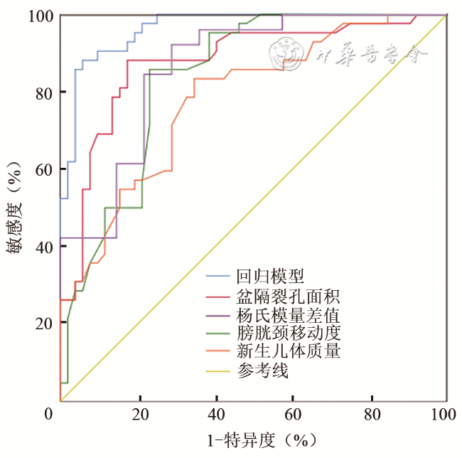 本研究应用单因素分析以及二分类Logistic回归对阴道分娩者产后PFD的相关因素进行综合分析并建立回归模型,包括临床参数、经会阴超声检查参数及杨氏模量值。将单因素分析中对诊断PFD有意义的变量纳入方程,结果显示新生儿体质量、BND和LHA是阴道分娩后PFD的独立危险因素,杨氏模量值差值是阴道分娩后PFD的独立保护因素。本研究中LHA的