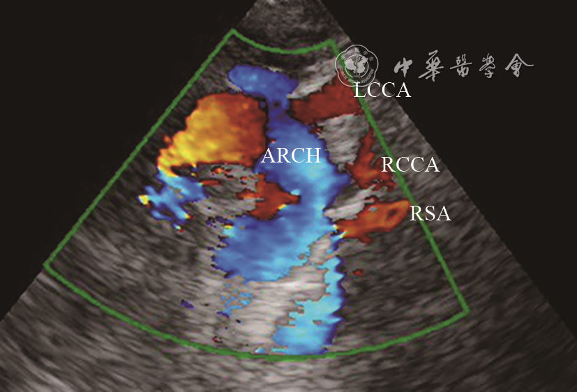 图1 孤立性左锁骨下动脉患儿出生后第4天超声心动图胸骨上窝主动脉弓长轴切面显示弓上3个分支注:ARCH为主动脉弓;LCCA为左颈总动脉;RCCA为右颈总动脉;RSA为右锁骨下动脉 |
