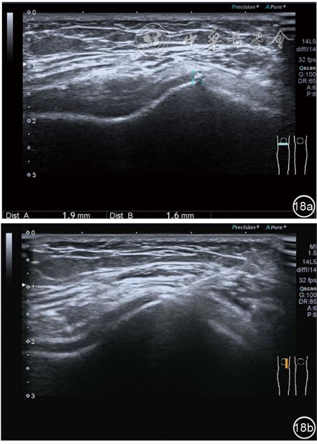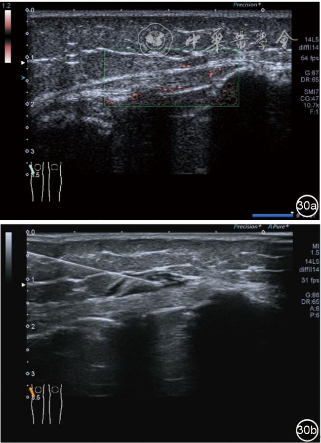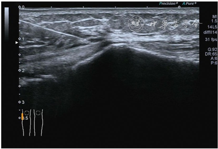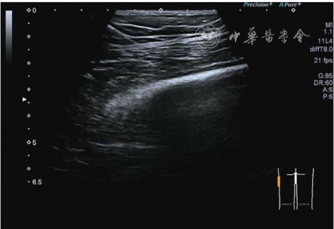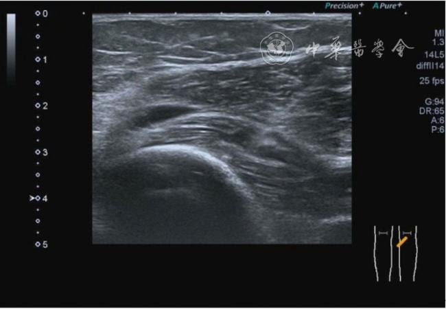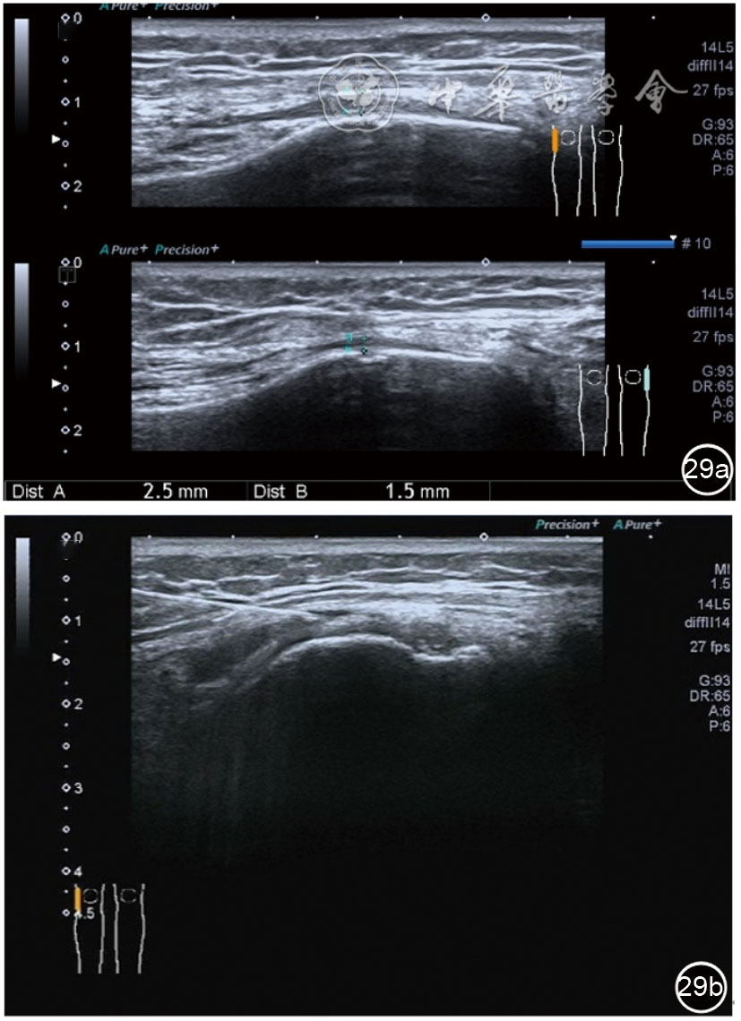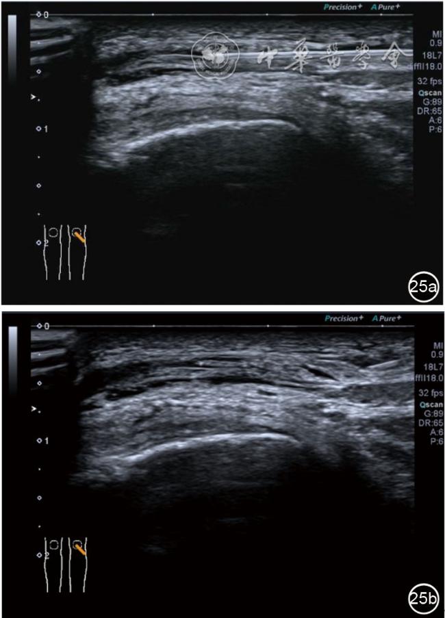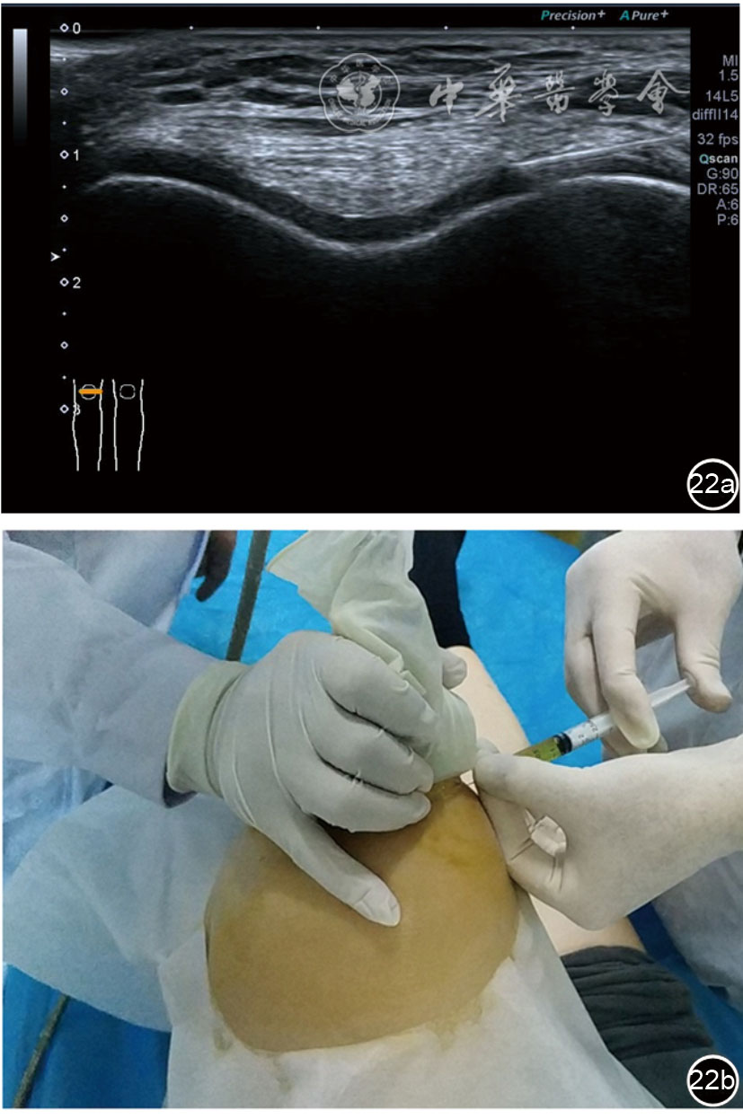 图21)。膝关节软骨损伤的主要部位在髌股关节的股骨髁,超声可以很好地显示这一部位,并能显示软骨变薄。因此,由这个路径平面内进针注射,可以很好显示穿刺针的路径与位置。以注射PRP为例。患者平卧位,膝关节屈曲100°~120°,选用10 MHz超声探头,治疗前消毒准备同骨赘针刀剥离松解治疗。将探头置于患者皮肤表面,短轴扫查显示关节面,应用25G注射针头,抽吸1%利多卡因2 ml由内侧进针进行分层麻醉直达关节软骨面。制备4.5 ml PRP,直接注射到关节面,液体顺关节面分布,注射完毕拔出针头(
