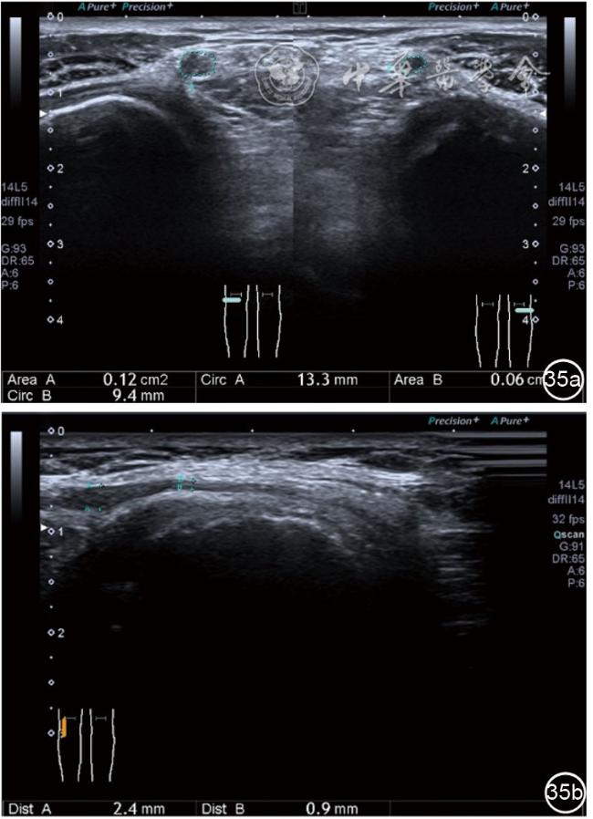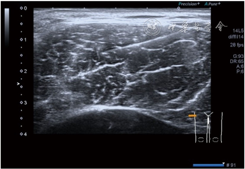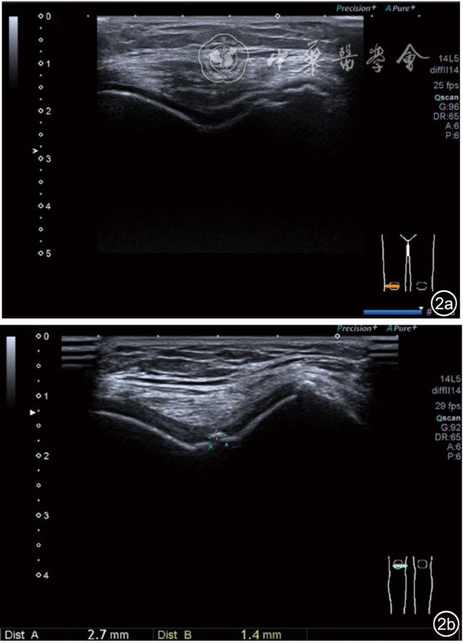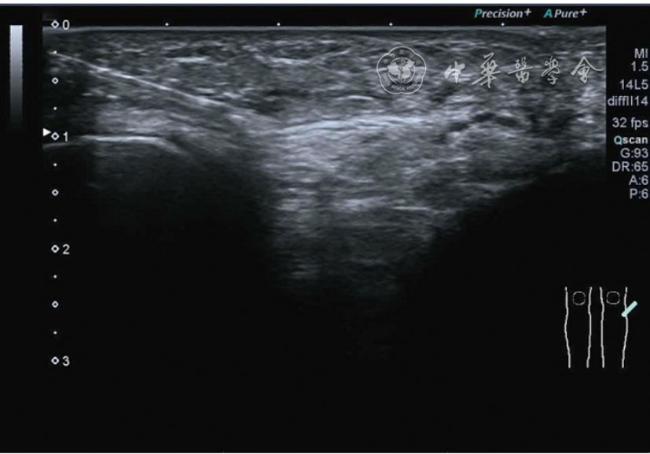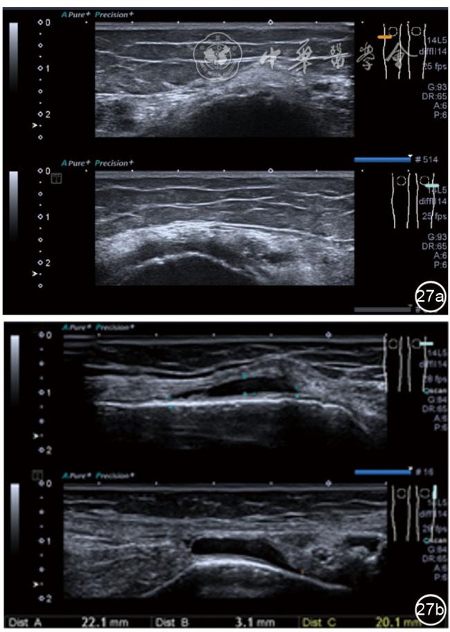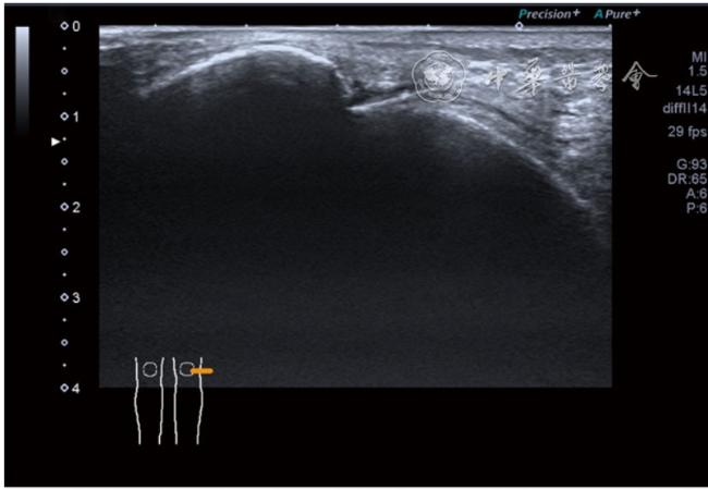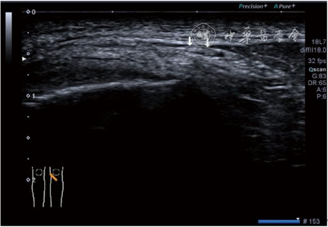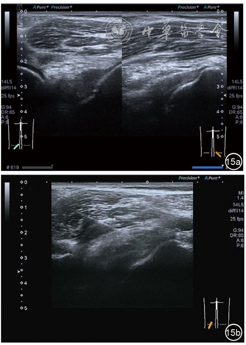 图21)。膝关节软骨损伤的主要部位在髌股关节的股骨髁,超声可以很好地显示这一部位,并能显示软骨变薄。因此,由这个路径平面内进针注射,可以很好显示穿刺针的路径与位置。以注射PRP为例。患者平卧位,膝关节屈曲100°~120°,选用10 MHz超声探头,治疗前消毒准备同骨赘针刀剥离松解治疗。将探头置于患者皮肤表面,短轴扫查显示关节面,应用25G注射针头,抽吸1%利多卡因2 ml由内侧进针进行分层麻醉直达关节软骨面。制备4.5 ml PRP,直接注射到关节面,液体顺关节面分布,注射完毕拔出针头(