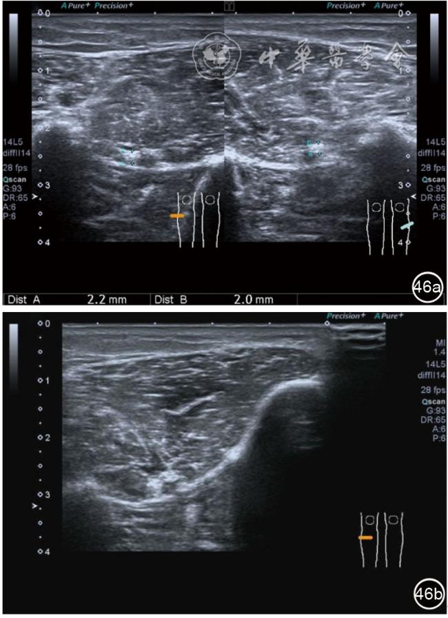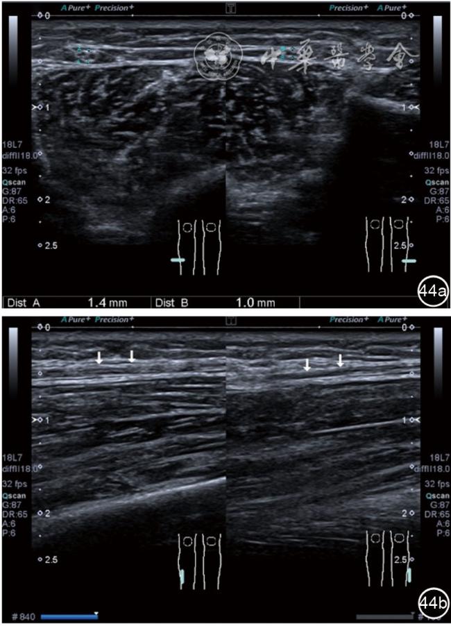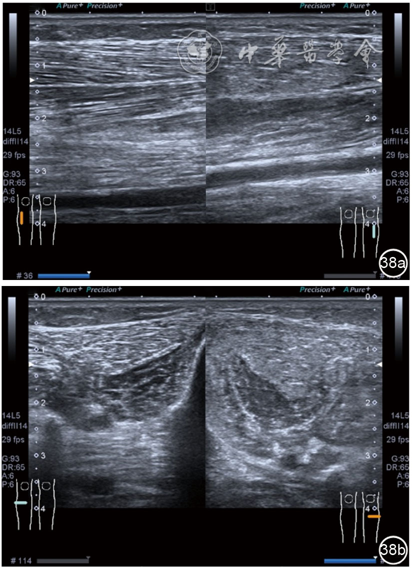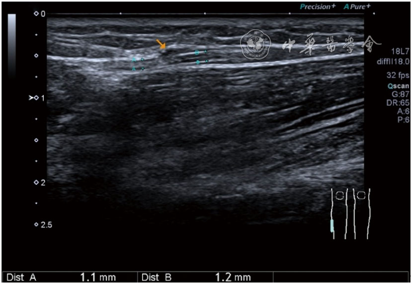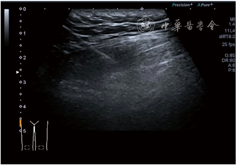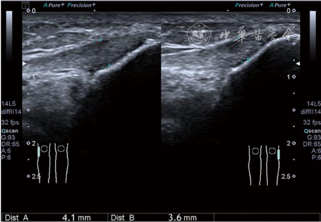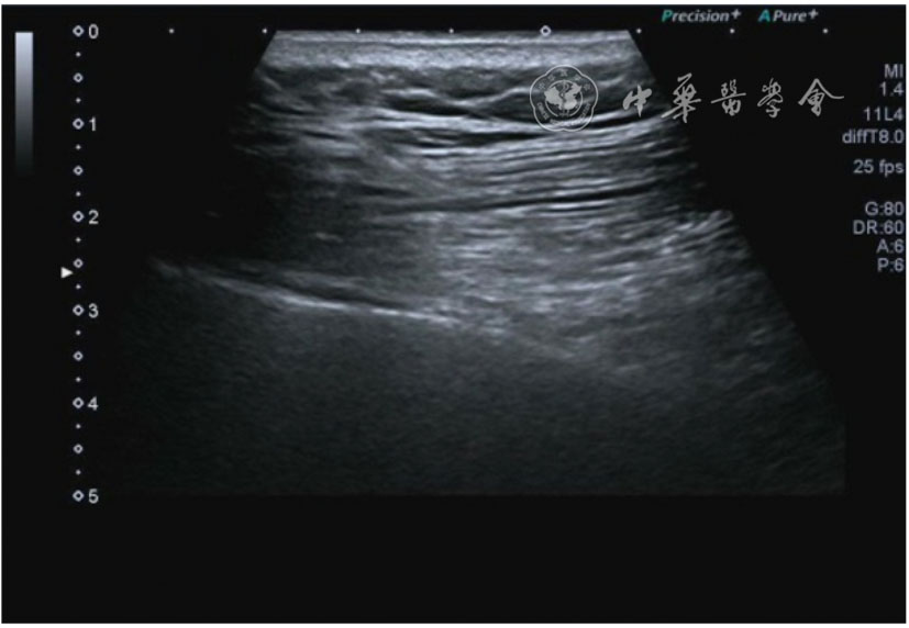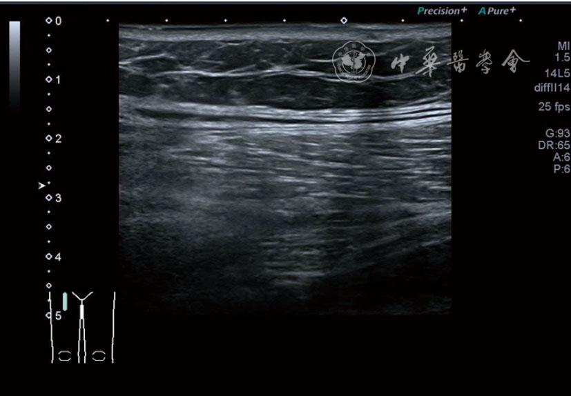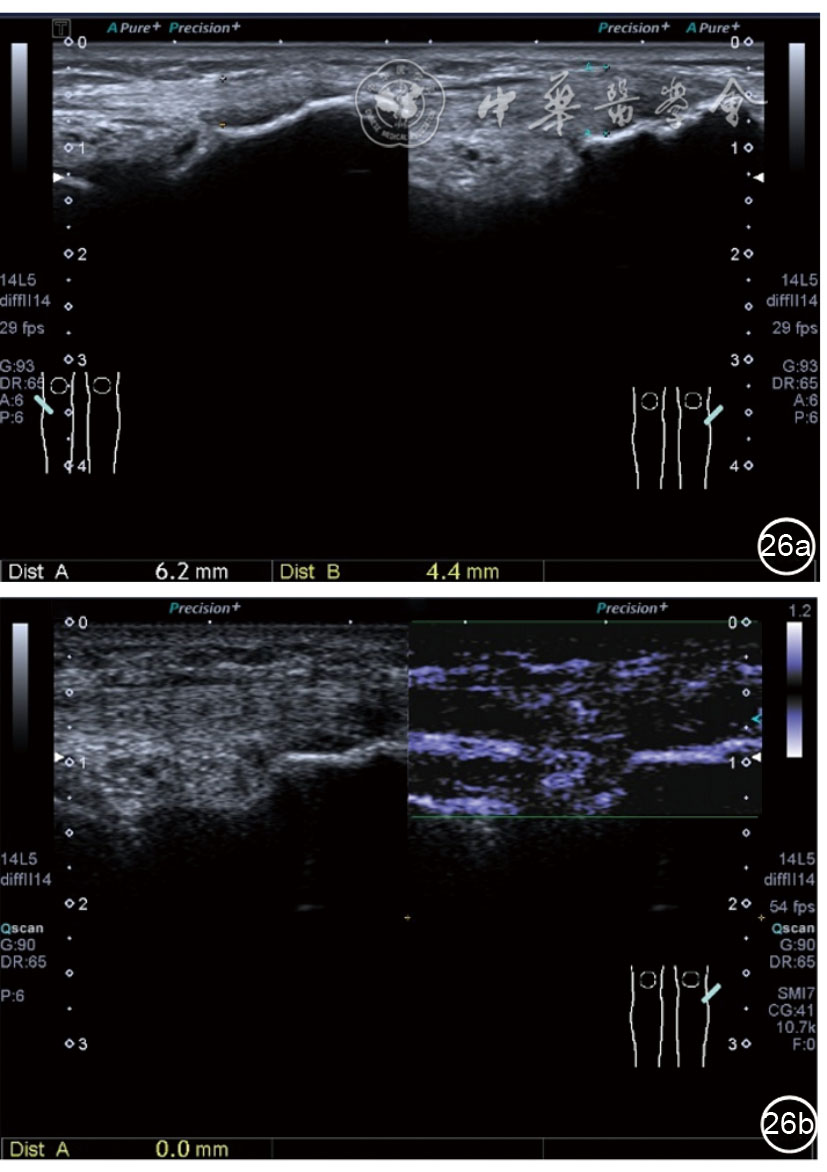 图21)。膝关节软骨损伤的主要部位在髌股关节的股骨髁,超声可以很好地显示这一部位,并能显示软骨变薄。因此,由这个路径平面内进针注射,可以很好显示穿刺针的路径与位置。以注射PRP为例。患者平卧位,膝关节屈曲100°~120°,选用10 MHz超声探头,治疗前消毒准备同骨赘针刀剥离松解治疗。将探头置于患者皮肤表面,短轴扫查显示关节面,应用25G注射针头,抽吸1%利多卡因2 ml由内侧进针进行分层麻醉直达关节软骨面。制备4.5 ml PRP,直接注射到关节面,液体顺关节面分布,注射完毕拔出针头(