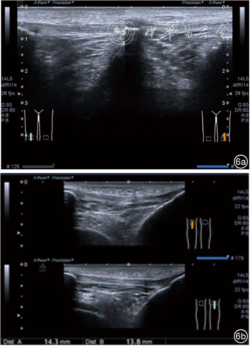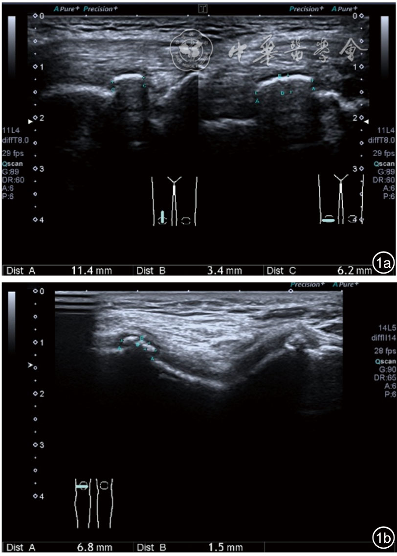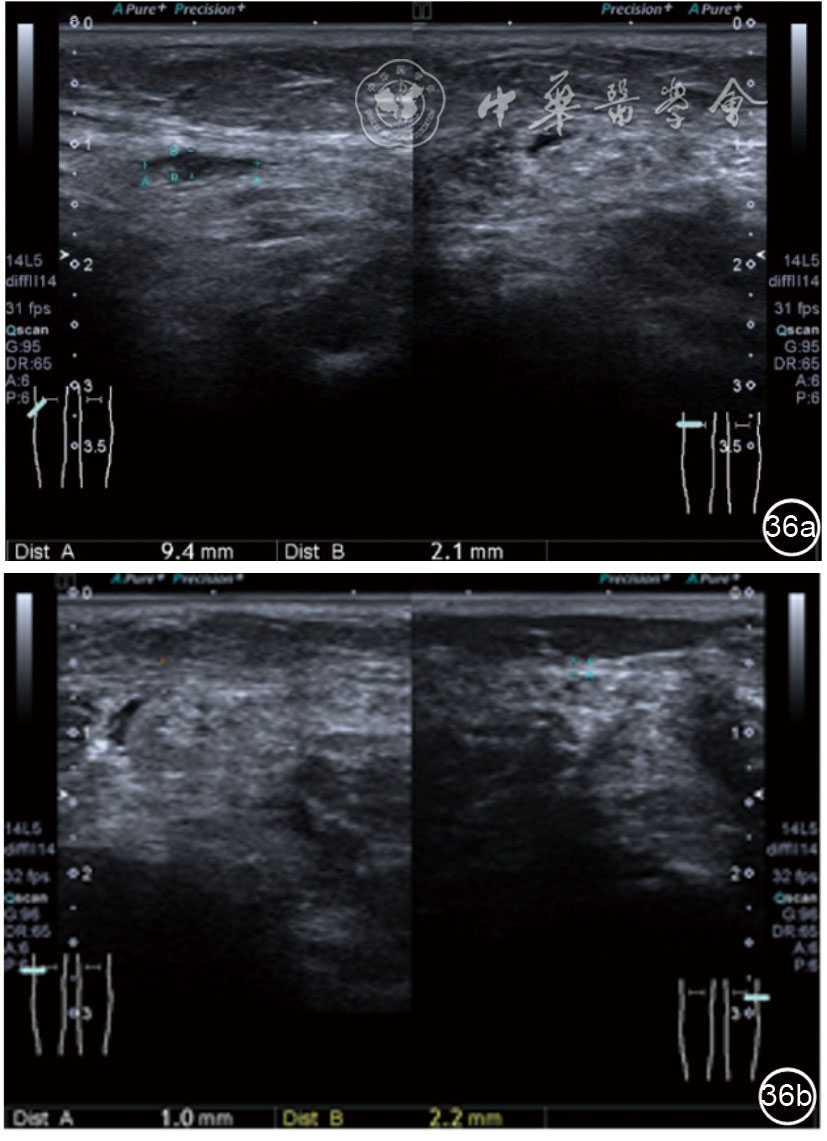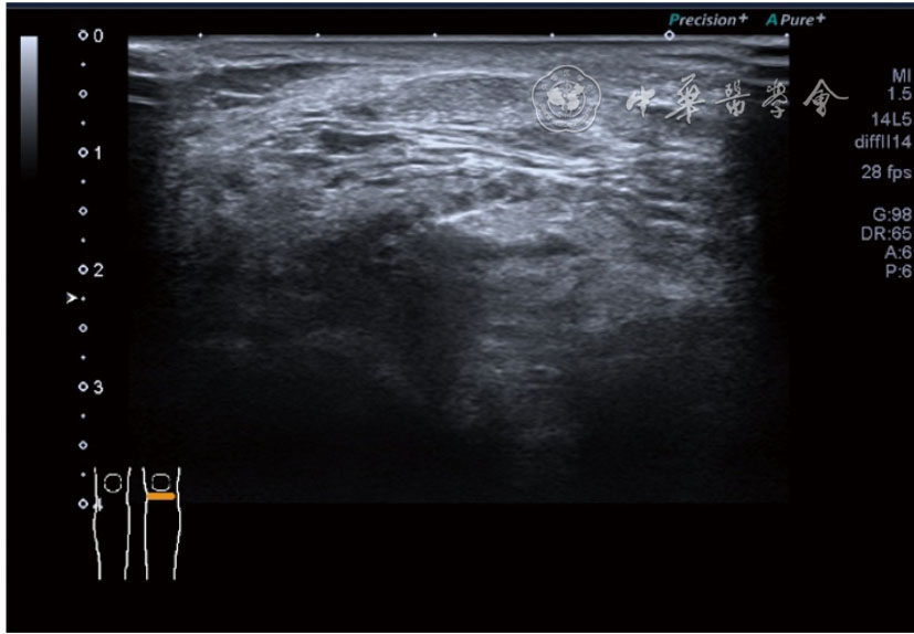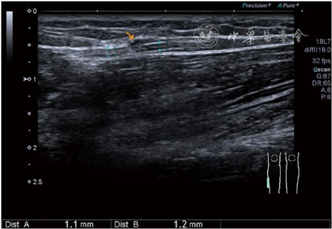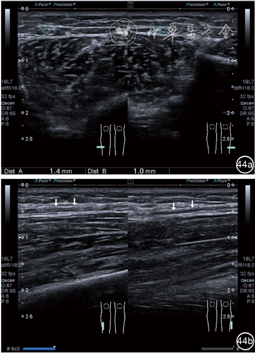 图21)。膝关节软骨损伤的主要部位在髌股关节的股骨髁,超声可以很好地显示这一部位,并能显示软骨变薄。因此,由这个路径平面内进针注射,可以很好显示穿刺针的路径与位置。以注射PRP为例。患者平卧位,膝关节屈曲100°~120°,选用10 MHz超声探头,治疗前消毒准备同骨赘针刀剥离松解治疗。将探头置于患者皮肤表面,短轴扫查显示关节面,应用25G注射针头,抽吸1%利多卡因2 ml由内侧进针进行分层麻醉直达关节软骨面。制备4.5 ml PRP,直接注射到关节面,液体顺关节面分布,注射完毕拔出针头(