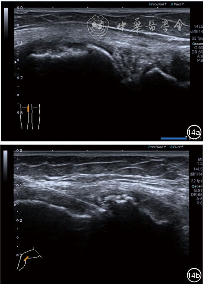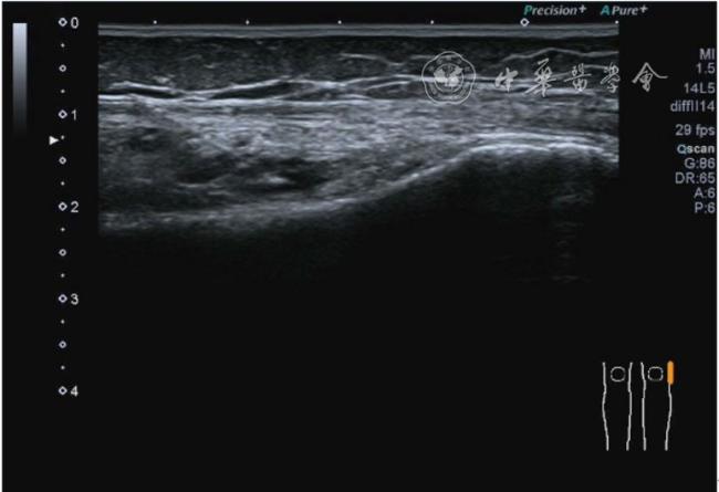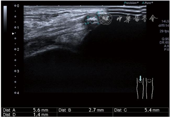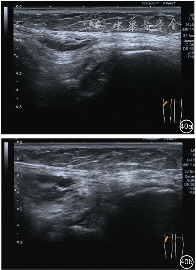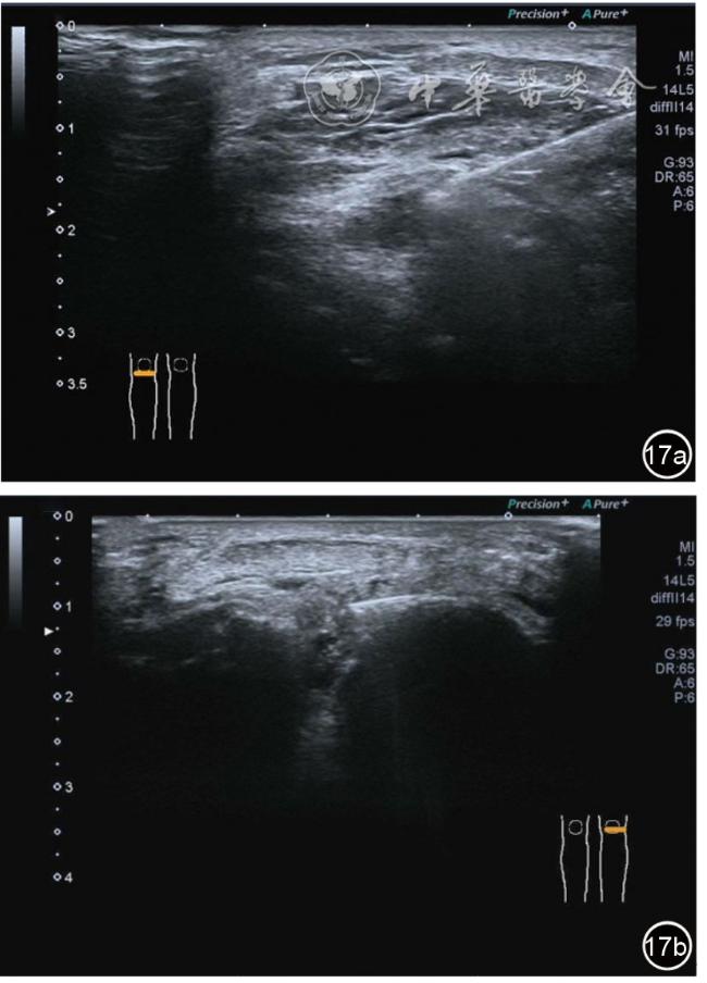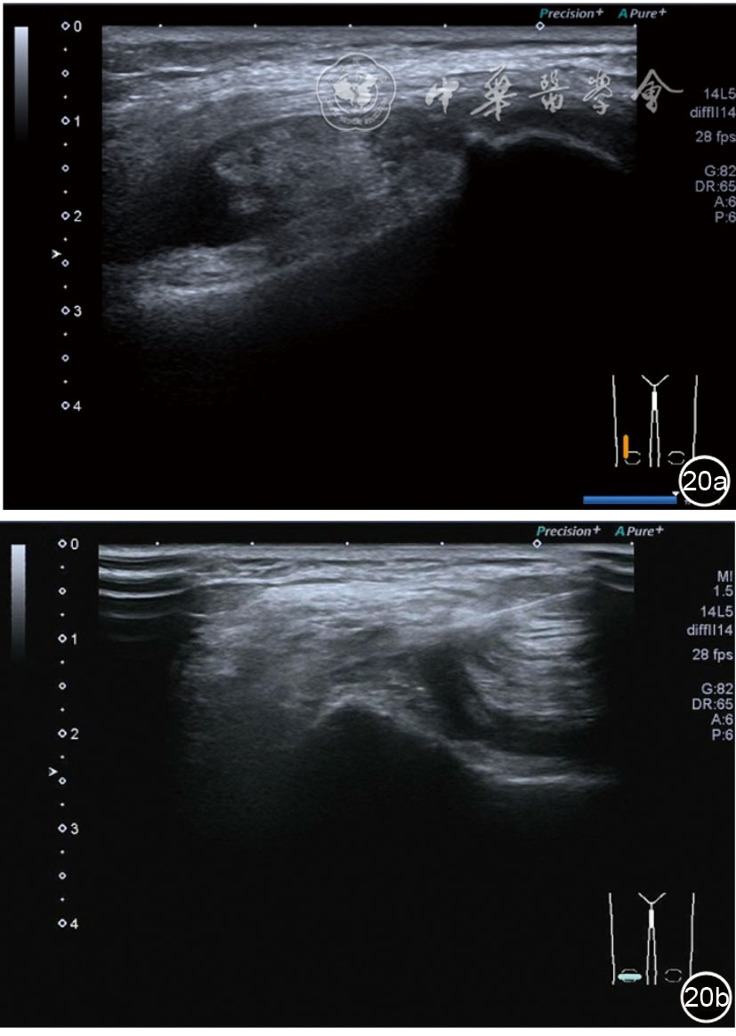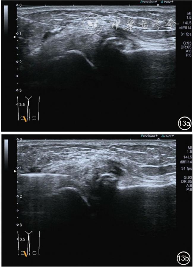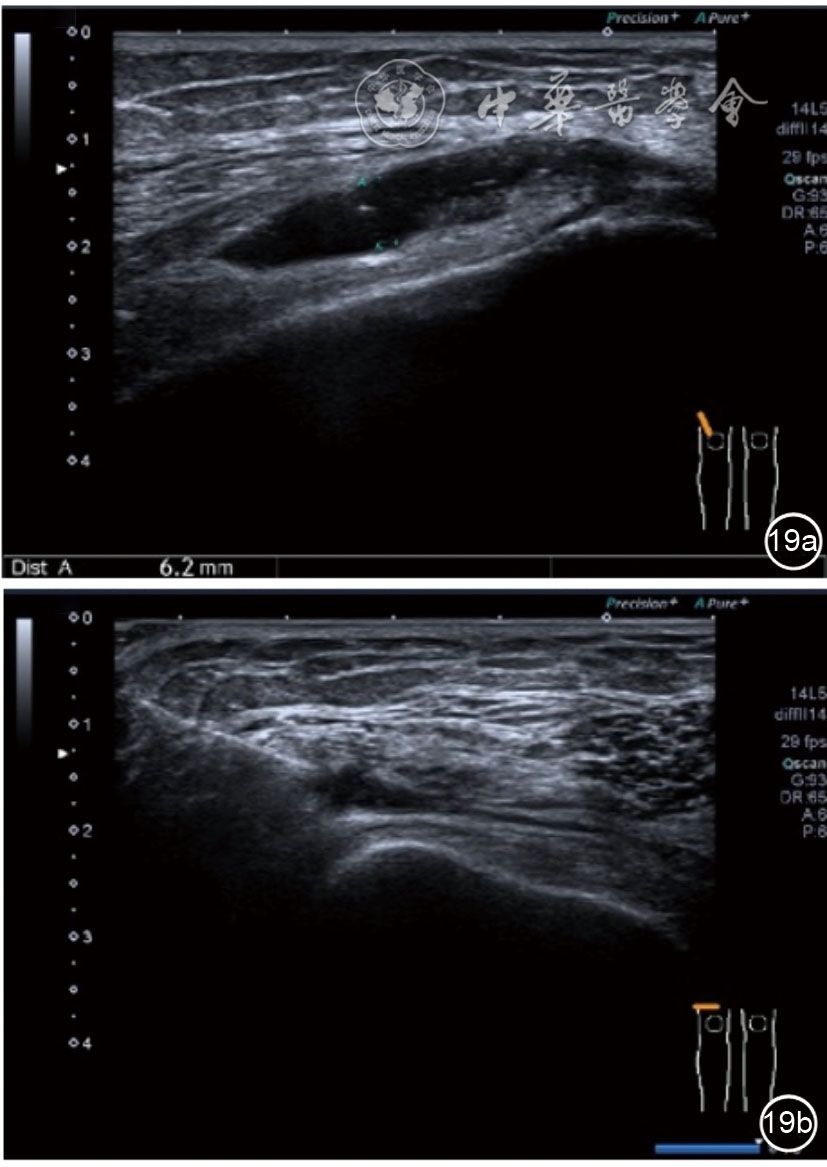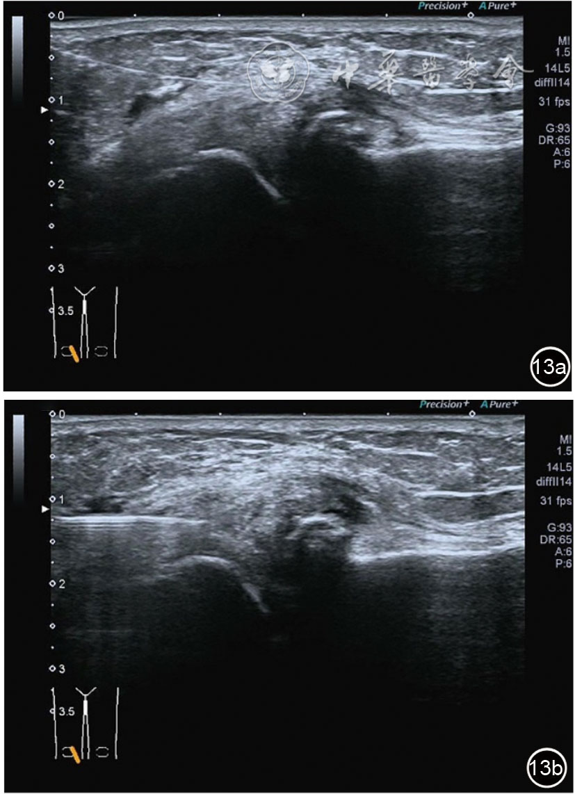 图19),局部压迫2分钟,无菌敷料覆盖。②髌上囊慢性滑膜炎针刀切割松解治疗。患者平卧位,膝关节屈曲30°~60°,膝下垫一软枕。选用10 MHz超声探头,治疗前消毒准备同骨赘针刀剥离松解治疗。将探头置于患者皮肤表面,长轴或短轴扫查,找到积液最多处,用一次性5 ml注射器抽吸1%利多卡因3 ml于髌上囊进行分层注射麻醉,囊内也要注射适量麻药,尽量抽出积液。选用直径1 mm的Ⅰ型2号针刀,长轴扫查从近端向远端,短轴扫查从外侧向内侧,在超声引导下进入囊肿内对内壁及增生滑膜的不同方向、角度进行反复切割(
