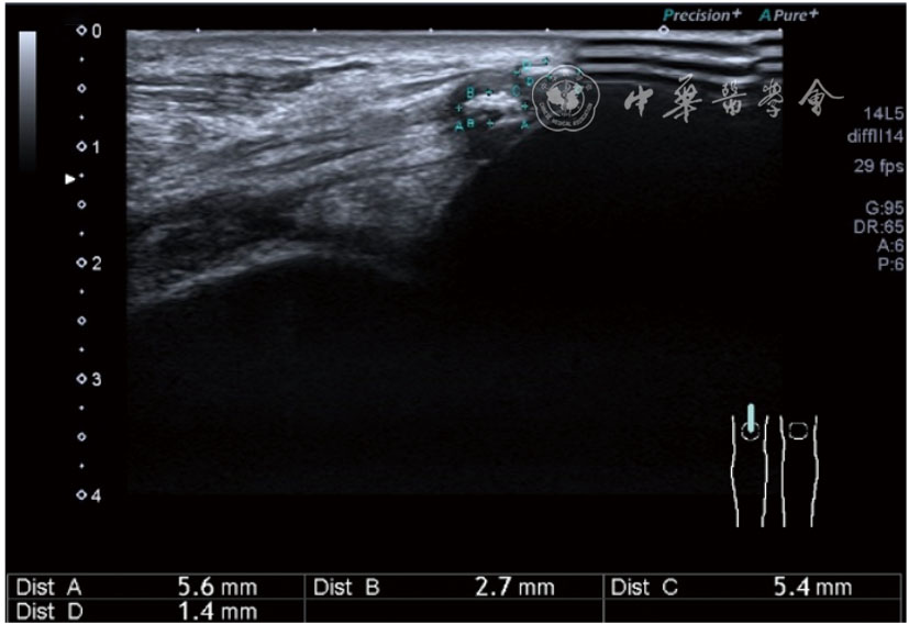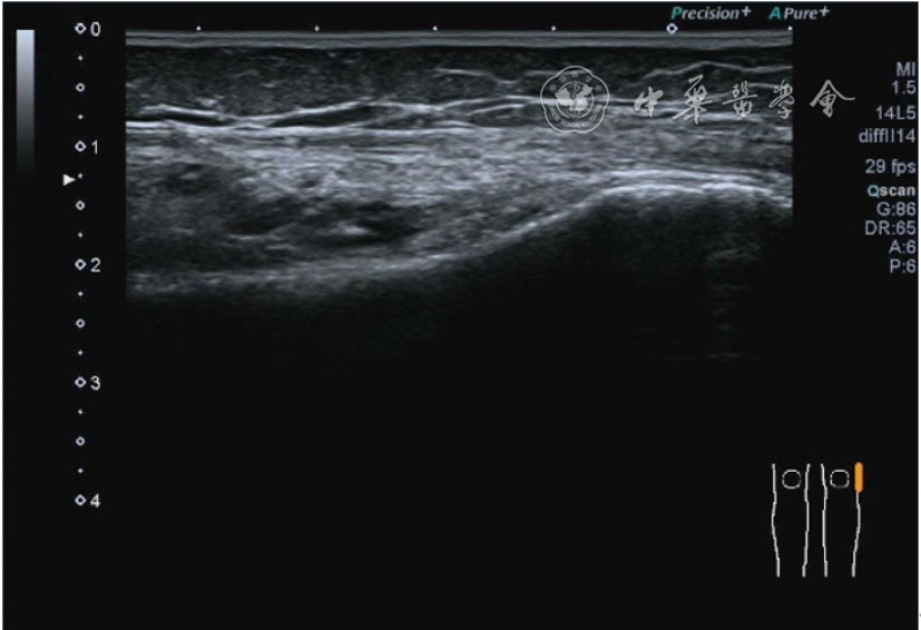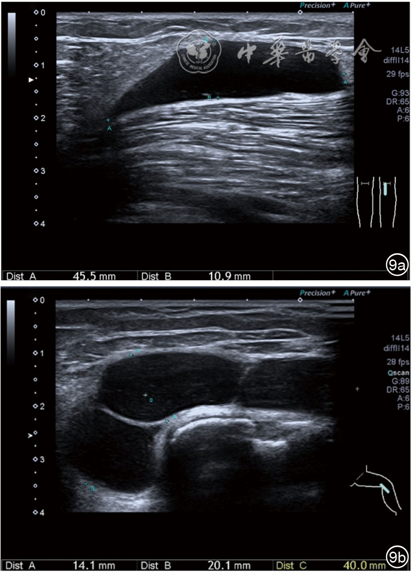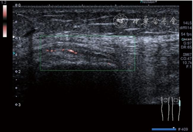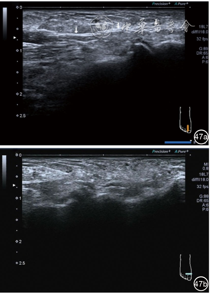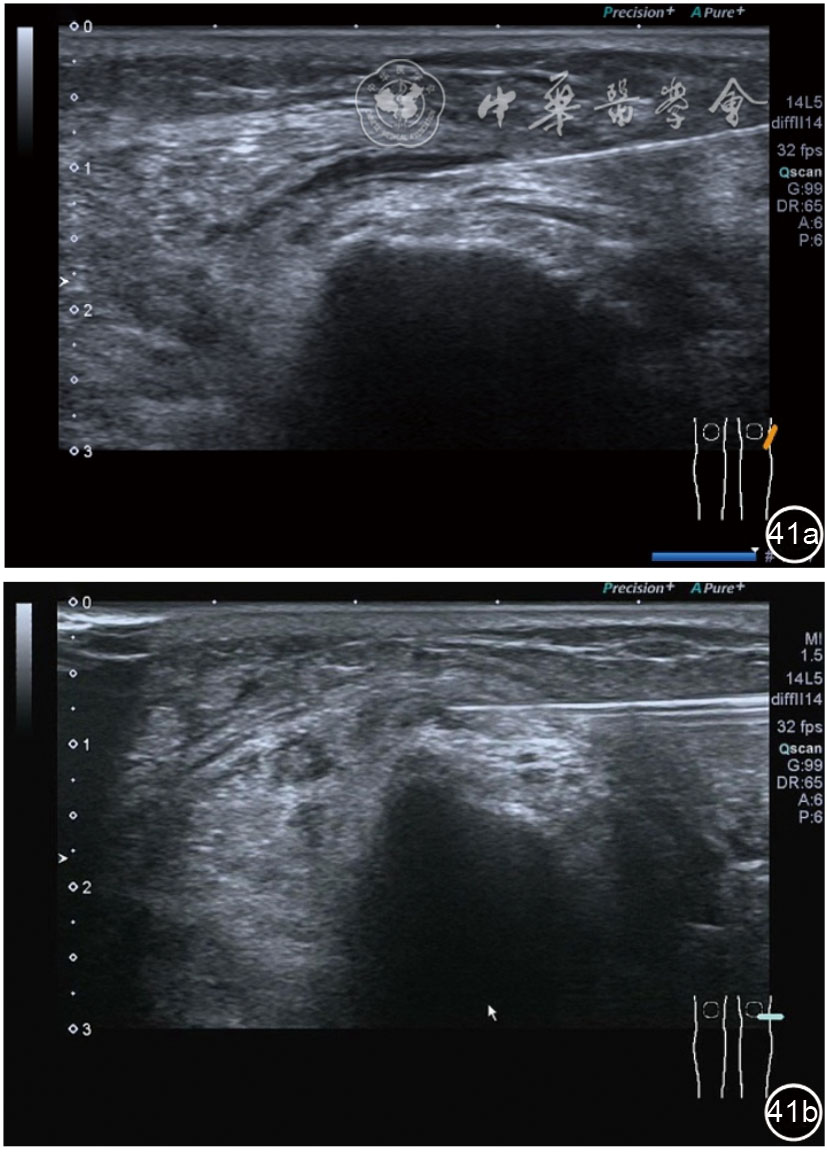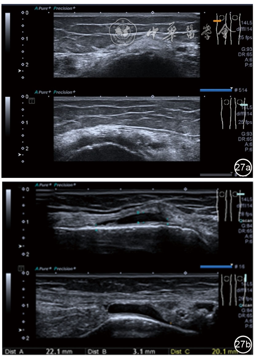 图19),局部压迫2分钟,无菌敷料覆盖。②髌上囊慢性滑膜炎针刀切割松解治疗。患者平卧位,膝关节屈曲30°~60°,膝下垫一软枕。选用10 MHz超声探头,治疗前消毒准备同骨赘针刀剥离松解治疗。将探头置于患者皮肤表面,长轴或短轴扫查,找到积液最多处,用一次性5 ml注射器抽吸1%利多卡因3 ml于髌上囊进行分层注射麻醉,囊内也要注射适量麻药,尽量抽出积液。选用直径1 mm的Ⅰ型2号针刀,长轴扫查从近端向远端,短轴扫查从外侧向内侧,在超声引导下进入囊肿内对内壁及增生滑膜的不同方向、角度进行反复切割(