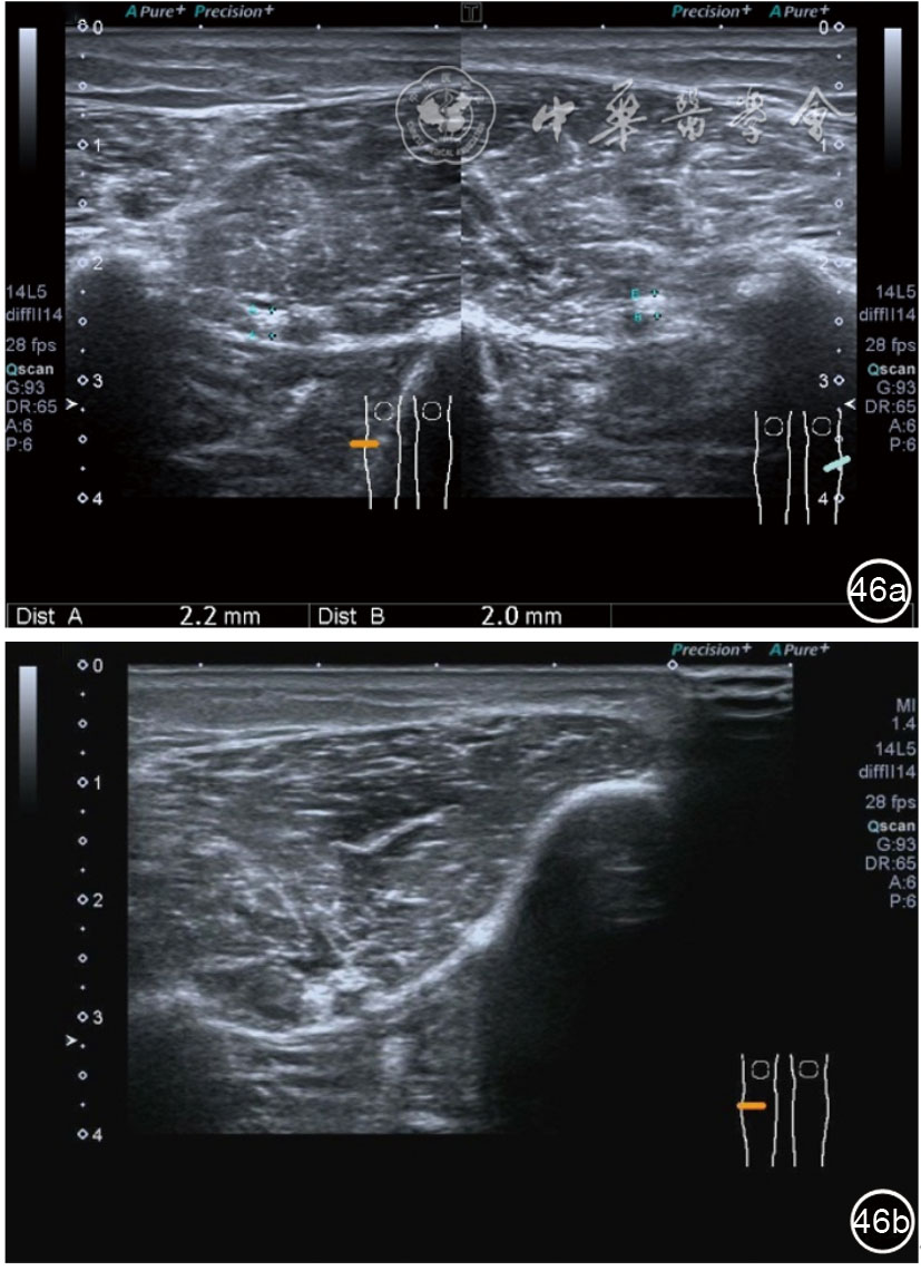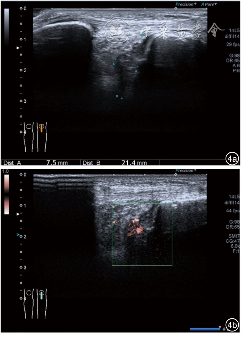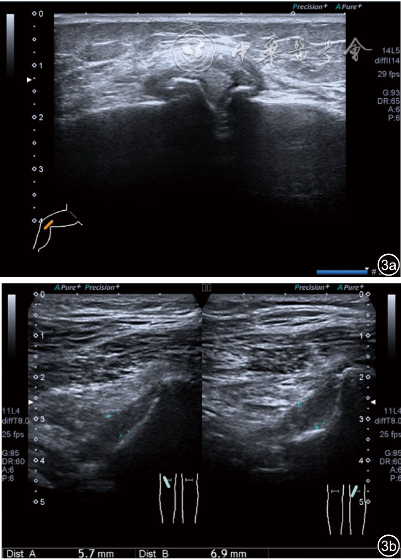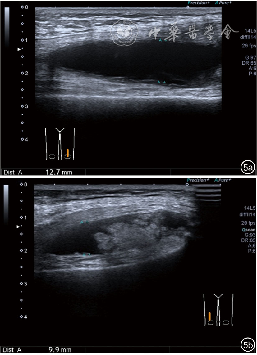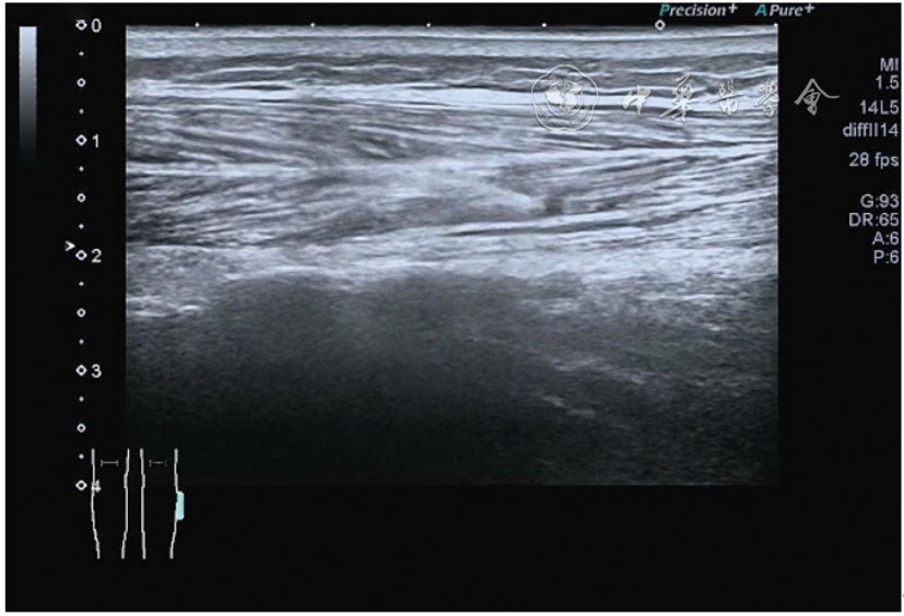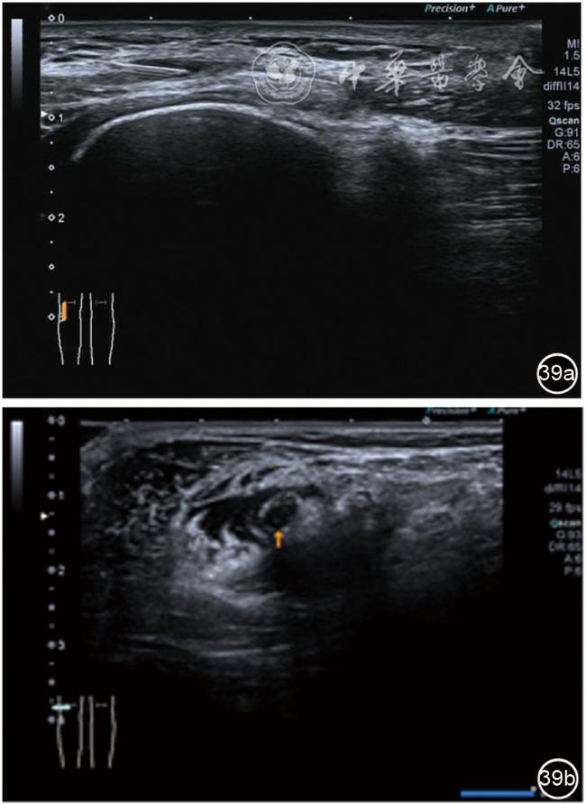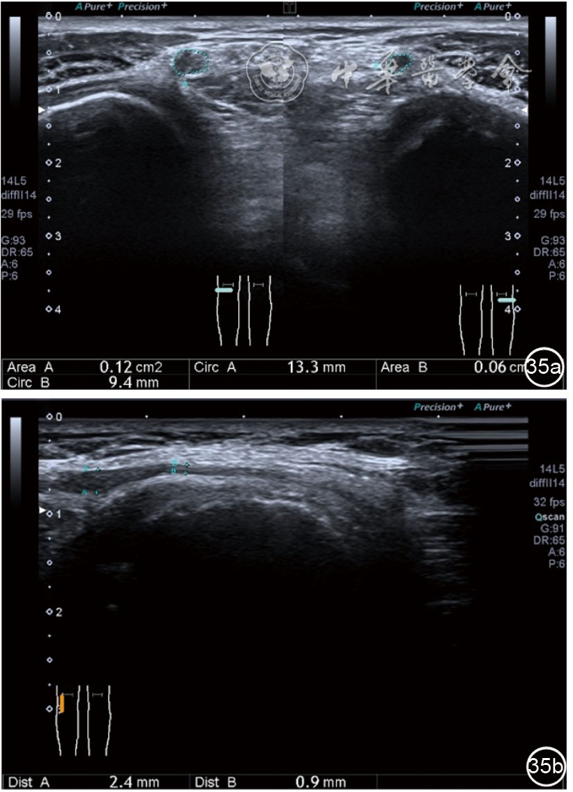 图19),局部压迫2分钟,无菌敷料覆盖。②髌上囊慢性滑膜炎针刀切割松解治疗。患者平卧位,膝关节屈曲30°~60°,膝下垫一软枕。选用10 MHz超声探头,治疗前消毒准备同骨赘针刀剥离松解治疗。将探头置于患者皮肤表面,长轴或短轴扫查,找到积液最多处,用一次性5 ml注射器抽吸1%利多卡因3 ml于髌上囊进行分层注射麻醉,囊内也要注射适量麻药,尽量抽出积液。选用直径1 mm的Ⅰ型2号针刀,长轴扫查从近端向远端,短轴扫查从外侧向内侧,在超声引导下进入囊肿内对内壁及增生滑膜的不同方向、角度进行反复切割(