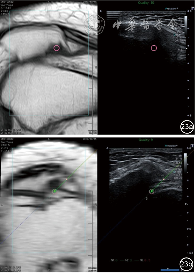 图22)。局部压迫2分钟,无菌敷料覆盖。(4)髌骨软化超声影像融合技术下PRP注射治疗。髌骨软化是指髌骨关节面的软骨损伤,软骨下骨囊变,MRI能够明确诊断,但是超声不能显示。应用超声与MRI的影像融合技术,依据MRI明确注射部位,在超声引导下可将药物精准注射到软骨损伤的部位。患者平卧位,膝关节屈曲30°,下面垫一软枕。一般选用10 MHz超声探头,治疗前消毒准备同骨赘针刀剥离松解治疗。将MRI的原始图像数据导入超声设备中,进行手动影像融合,完全融合后,确定穿刺靶点,以MRI图像为目标,以超声图像为实时引导进行穿刺,到达目标后,注射提前制取的PRP 3 ml(