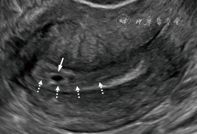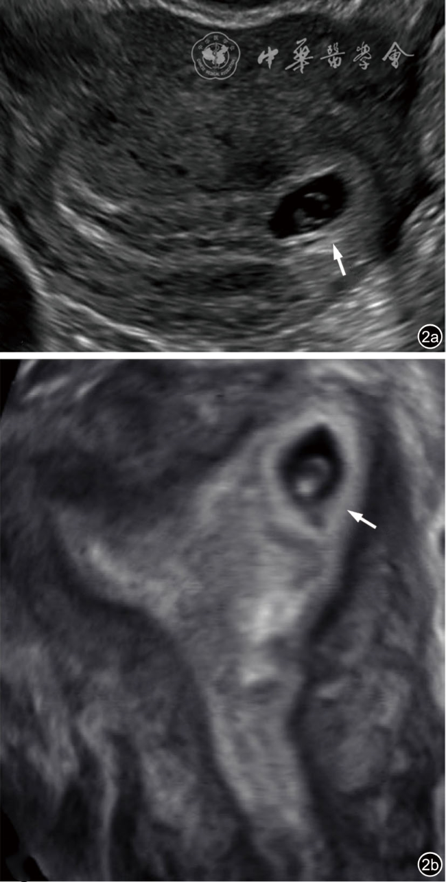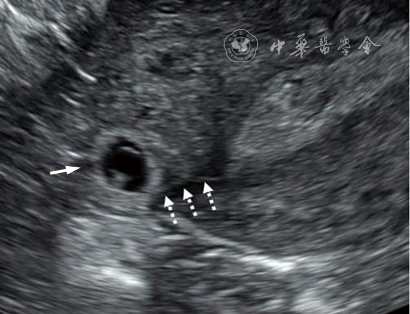 | 可疑EPL | 实线箭头:卵黄囊;虚线箭头:羊膜 | 正常着床的妊娠囊,可能无进展 | 失败、不确定存活的宫内妊娠 | 经阴道超声的诊断标准:胚胎CRL<7 mm及无心管搏动;妊娠囊MSD 16~24 mm及无胚胎;无卵黄囊的妊娠囊,7~13 d后仍无胚胎及心管搏动;有卵黄囊的妊娠囊,7~10 d后无胚胎及心管搏动;卵黄囊增大(>7 mm);末次月经6周后仍无胚胎 |