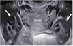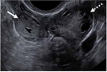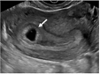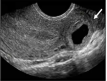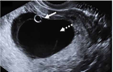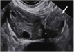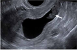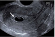 | 未知部位妊娠 | 箭头:卵巢(横切面) | 无宫内妊娠或异位妊娠征象 | - | 鉴别诊断:①因妊娠时间短尚未显示的早期宫内妊娠,②未显示的异位妊娠,③已完全排出的早期妊娠丢失;结合hCG变化趋势及后续超声复查;hCG≥3000 mIU/ml时大多数宫内妊娠经阴道超声可观察到;未知部位妊娠不能应用于已有超声征象提示可疑宫内妊娠或异位妊娠时(即使未见明确卵黄囊或胚胎) |