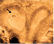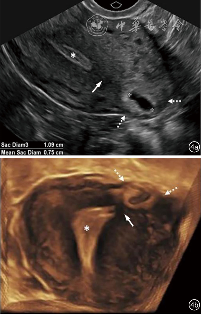 | 子宫畸形合并妊娠 | 箭头:宫内妊娠,妊娠囊位于纵隔子宫之右侧宫角内(三维超声冠状面重建图) | - | 单角妊娠、双角妊娠 | 超声报告提示举例:妊娠囊位于一侧的子宫角内;妊娠囊位于纵隔子宫之右侧宫角内 |