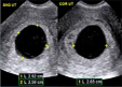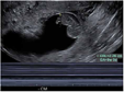 | 附件区包块(附件肿物) | 实线箭头:卵巢外包块(输卵管异位妊娠);测量游标:卵巢 | 不与卵巢相连,回声及血流信号分布方式多样 | - | 若无宫内妊娠,该征象出现时需高度怀疑输卵管异位妊娠;“滑动征”有助于鉴别该包块是否与卵巢或子宫分开 |