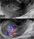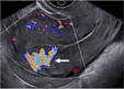 | 子宫肌层血管分布增强 | 箭头:子宫肌层血管分布增强 | 胚胎着床部位深部肌层出现的局灶性血管增多 | - | 在不完全或完全EPL后出现;该征象较典型、可自发缓解;需要与动静脉瘘、动静脉畸形、胎盘附着部位复旧不全鉴别 |
