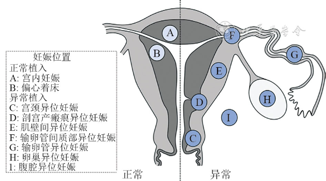 | 异位妊娠 | 箭头:左侧输卵管间质部异位妊娠(横切面) | 非正常部位着床的妊娠 | 宫角异位妊娠、剖宫产瘢痕妊娠、宫颈妊娠、存活/存活状态、异位妊娠、可存活异位妊娠 | 如果不治疗,孕妇存在发生并发症或死亡风险这是个通用术语,如有可能应报告病变的侧别(如左侧或右侧)及具体部位(如下):输卵管异位妊娠(包括峡部、壶腹部、漏斗部)、输卵管间质部异位妊娠、剖宫产瘢痕异位妊娠、宫颈异位妊娠、卵巢异位妊娠、腹腔异位妊娠及子宫肌壁间异位妊娠需注明是否可见卵黄囊、胚胎/胎儿及心管搏动/胎心搏动以助于治疗方案的确定;诊断分类为“可疑异位妊娠”或“明确异位妊娠”;若在子宫下段/宫颈内,需与进行中早期妊娠丢失鉴别,不确定时需短期随访 |